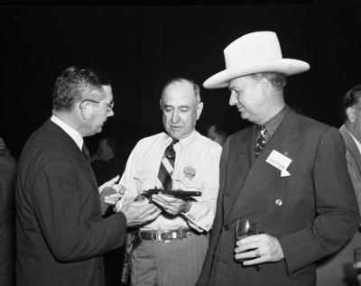 Two unidentified men (left and right) with Amon Carter, Sr. (center) at the American Petroleum Institute party at Shady Oak Farm. Carter is inspecting a handgun.