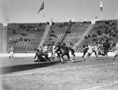 The Boston College Eagles and the Clemson Tigers are facing off in the 1940 Cotton Bowl. Action play.