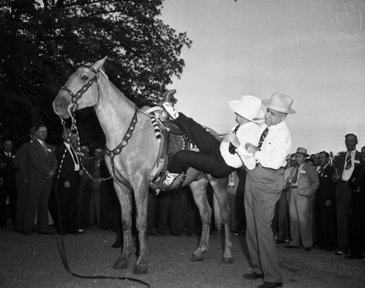 A crowd watches as Amon Carter, Sr. catches W. B. Pyron as he falls off a horse.