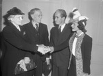 New Citizens of the United States, left to right are, Mrs. Bridget Ortolani, her husband, Attilio Ortolani, and Ted Samosch, and his wife Mrs. Betti Samosch. Mrs. Ortolani is a native of Ireland. She is wearing a hat and coat and carrying a purse and gloves. Mr. Ortolani is a former Italian consul for North Texas and is a native of Italy. He is dressed in a three piece suit and is holding his hat. Mr. and Mrs. Samosch are from Germany. Mr. Samosch is dressed in a double breasted suit. Mrs. Samosch is wearing a hat, a coat with a fur collar, a blouse and skirt.