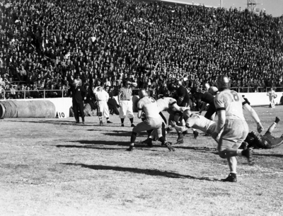 The Boston College Eagles and the Clemson Tigers are facing off in the 1940 Cotton Bowl. Action play.