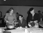 Marine Corporal Sam Rizzo being served a generous portion of black-eyed peas by Mrs. Paul Campbell, left, and Mrs. J. Lee Wallace, right, who prepared the peas for the Service Men's Center New Year's Day observance. Black eyed pea is believed to bring good luck in the new year 1945. Corporal Rizzo is sitting at table. On the table is the pot of peas. Mrs. Campbell is dishing out the peas while Mrs. Wallace is pouring coffee. Published in the Fort Worth Star-Telegram morning edition, January 2, 1945.