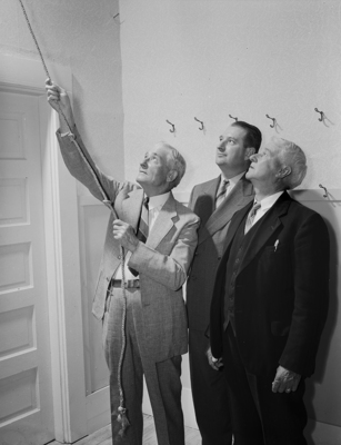 Image shows members of the Morningside Christian Church are left to right, L. L. Dees, Reverend Lloyd H. Thompson, and W. H. Burns. Mr. Dees, chairman of deacons and elders, is ringing the church bell of the completely remodeled building, which is ready for dedication. The bell is over ninety years old and once called worshipers to church in Stephenville, Texas. Mr. Dees is dressed in a tweed suit. Reverend Thompson is Morningside's pastor. He is wearing a double breasted suit. Mr. Burns is a veteran member of the church. He is dressed in a three piece suit. Published in the Fort Worth Star-Telegram evening edition June 1, 1940.