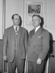 New Justice -- Gordon Simpson, left, associate justice of the Supreme Court of Texas, talking with Cecil Morgan, president of the Fort Worth, Texas Bar Association, at a meeting of the bar which was addressed by Mr. Simpson. Mr. Simpson and Mr. Morgan are standing in front of a wall and are wearing suits and have on eyeglasses. Hung on the wall behind them is a calendar. Published in The Fort Worth Star-Telegram morning edition, January 14, 1945.