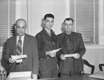 War bonds were awarded by Armour and Company to W. E. Ashmore, left, supply controller; Johnny Strickland, center, machine shop worker; and Preston Powell, right, foreman of the livestock department, for ideas for improvement of quality, method, safety and equipment at the plant. Mr. Ashmore and Mr. Powell are wearing suits and Mr. Strickland is wearing a collared shirt and overalls. Mr. Preston is wearing eyeglasses. The three are standing and are holding their awards in their hands. Behind them are two windows with the blinds shut. Published in Fort Worth Star-Telegram, morning edition, January 16, 1945.