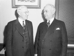 Reverend W. W. Ward and Bishop A. Frank Smith of Houston, Methodists.Two older men in suits and eyeglasses in an office looking room with a piece of framed art above their heads and a large dictionary on the table behind them. A translucent glass window is in view. Ward is wearing a single-breasted three-piece suit with a light shirt, dark printed tie, and a watch chain. Smith is wearing a three-piece double-breasted suit with a light shirt and a dark printed tie. There is a handkerchief poking out of his breast pocket. Clipping:"START OF CRUSADE--Two Methodist leaders, Rev. W. W. Ward, left, district superintendent, and Bishop A. Frank Smith of HOuston, right, discuss the start of the Crusade for Christ of the Methodist Church in the Central Texas Conference. (Staff Photo)." Stamped Star-Telegram Morn. Jan. 16, 1945.