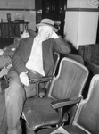 J. D. Graham is one of the passengers stranded at the Bowen Bus Terminal. He is sitting on a chair, sleeping, awaiting for a bus to take him home to Cleburne, Texas. Mr. Graham is wearing a collared shirt, coat, trousers and a hat. Sitting behind him is an unidentified man. Published in Fort Worth Star-Telegram, evening edition, January 16, 1945.