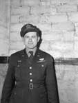 Lieutenant Charles W. Hunter, bombardier with the 8th Army Air Forces, is standing against a brick wall and wearing his military uniform. Lieutenant Hunter wears the Air Medal with four clusters, Presidential unit citation with cluster and the American Defense and European theater ribbons. He has been overseas eight months, and now is visiting his wife, the former Miss Betty Lou Burton of Richland, and their infant son, Dan Webster Hunter. Lieutenant Hunter attended the Riverside elementary school and high school at Millsap. He drove a Bowen bus three years before entering the service in 1943. Hunter received his wings and commission in February 1944 at Deming, New Mexico. Published in Fort Worth Star-Telegram, morning edition, January 20, 1945.