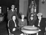Office of Price Administration consumer advisory committee. Seated, left to right: Mrs. Marie Cullom, Mrs. James Leonard, Mrs. Oneita Pierce of Denton, Texas; and Mrs. Sherwood Avery. Standing, left to right: R. H. Lawrence and Jack H. Kultgen. The women are shown sitting around a small, circular table with Lawrence and Kultgen standing behind them. The two men are wearing suits while the women are wearing either skirts and jackets or long-sleeved dresses. Mrs. Cullom is also holding a small purse in her lap while both Mrs. Pierce and Mrs. Avery are wearing hats. further in the background, the rest of the dining hall can be seen, as well as a large window.