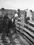 The Southwestern Exposition and Fat Stock Show is issuing advance publicity for the upcoming show unfolding March 9-18. Rodeo broncs are being led from a baggage coach at the Stock Show grounds. Leading a string of outlaw horses is Blockbuster, a big black bronc of rodeo fame. On the fence to greet the rodeo stock were, left to right, are Bill Iler, A. K. Mackey, John B. Davis and Louis Kubitz. Mr. Iler is a bronc rider in the rodeo. He is dressed in a cowboy hat, western shirt, jeans, and cowboy boots. Mr. Mackey is the general livestock superintendent. He is wearing a hat and a coat. Mr. Davis, secretary-manager, is dressed in a hat, suit, and an overcoat. Mr. Kubitz is the superintendent of rodeo livestock. Ge us wearing a hat, suit, and a coat.