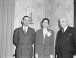 Mary Brown Crawford, missionary, center. A woman standing between two men. The men are wearing double-breasted suits, the man on the right has a three-piece suit. Ms. Crawford is wearing a women's single breasted suit with a skirt. She was wearing a blouse with a cut-away collar and an orchid corsage, and holds a handkerchief or napkin in her hand. The man on the right has a folded handkerchief in his breast pocket. "Voice From Dark Continent Missionary Says War is Puzzling to Black Men" By James K. Thompson. Twenty-six years ago a dark-haired, gray-blue-eyed little girl came with her father, mother, younger sister and brother to Fort Worth to make her home. Twenty years passed, and, following what seem to her like a call to missionary service, she went to the Belgian Congo in Africa, the Dark Continent, and from which early purpose she never swerved. Mary Brown Crawford Tuesday morning spoke before a large audience at the First Presbyterian Church, in which she had her earlier membership, and served in the capacity of religious educational director from 1930-34. Miss Crawford is a graduate of the Arlington Heights High School, and of Texas Christian University in the class of 1930. Leaving Fort Worth in 1934, she entered the General Assembly's Training School of the Presbyterian Church, U. S., Richmond, Va., graduating in 1936. After two years as director of religious education in the Decatur, Ga., Presbyterian Church, she began the first lap of her immediate journey to Africa, through Belgium for a brief study of the French languageâ€â€the language of the Belgian Congoâ€â€and on to her field of labor, June 1938. The mission field to which Miss Crawford had been assigned, under the supervision of the Presbyterian Church, U. S., comprises more than two million of the ten million people who populate the Dark Continent. 'The gospel,' she said, 'the Bible fully translated in the language of the people, the schools under Christian auspices, available to all have made undoubted impact on the life of thousands of Afrikander's.' Replying quickly and alertly to the many questions asked her, Miss Crawford made it clear that women and girls in increasing areas are 'no longer the mere chattels of men, toilers in the fields, beasts of burden. Asked with regard to the effect of the war, she replied, 'relatively little, so far as mission work is concerned; but the people themselves have great difficulty in understanding why they should be compelled to fight the Christian white man's war and kill other white men.' And then she added: 'These black men, returning from seeing what they have never seen before, having passed through experiences they nave never remotely dreamed of, may well become one of the white man's greatest postwar problems. Miss Crawford is a niece of Dr. Frank C. Brown, pastor of the First Presbyterian Church, Dallas. Dr. and Mrs. Brown were guests at the luncheon given at the Fort Worth Church honoring Miss Crawford, who, when asked, when she expected to return to Africa, replied, as her face lighted expectantly, "just as soon as I can."