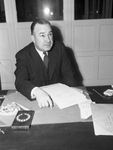Thomas L. Wrenn, Civil Aeronautics Board trial examiner, Washington. A man wearing a single-breasted three-piece suit sitting at a desk looking at applications for new routes. The desk contains a blotter pad with leather corners and an ashtray full of cigarette butts, a package of cigarettes, a matchbook, a pencil, and a metal case with alphabet cards for phone contacts. "HAS SOLOMON-LIKE JOB--Fortified by some Texas air and a little sunshine, Thomas L. Wrenn, Civil Aeronautics Board trail examiner, dived into applications for new airline routes shortly after his arrival here from Washington Tuesday. He'll start the month-long job of hearing the applications Wednesday. (Staff Photo.)"