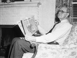 Asa S. Matthews is retiring from the United States Postal Service after more than forty-seven years. He plans to spend a majority of his retirement with his only grandchild, Carol Ann Reeder. He is pictured here. Mr. Matthews is enjoying his day off by lounging in a chair near a fireplace and reading the sports section of the Fort Worth Star-Telegram. He is wearing a dress shirt, necktie, and pinstripe trousers and eyeglasses.