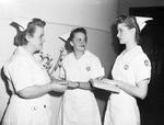 Cadet Nurses play cast. Left to right, Ruth Cunningham, Margie Crum and Kathryn Housley. Three nurses act out a wedding scene from a play. Ms. Cunningham has a pen and a pair of scissors (or a clump) in her uniform pocket. Ms. Crum is holding lilies as a mock bridal bouquet. "ALL IN FUN--Cadet Nurses Ruth Cunningham, left, Margie Crum, center, and Kathryn Housley enact the mock wedding scene to be featured in the nurses' minstrel show Friday at 8 p. m. at St. Mark's Methodist church. The Junior-B Class at Harris Methodist Hospital school of nursing is staging the production to raise funds for a junior-senior dance. (Staff Photo)."