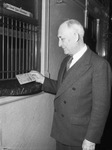 Clint J. Taylor, veteran superintendent of Railway Mail Service. A man looking down at a postal note money order form. He is wearing a double-breasted three-piece suit. "BUYS FIRST ONE--After a lapse of 51 years the post office department Thursday began issuing postal notes, simplified and cheaper money order form, and the first one issued here was bought by Clint J. Taylor, veteran superintendent of the Railway Mail Service. (Staff Photo).
