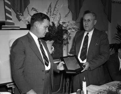 Texas Christian University Ex-students reunion dinner. Van Zandt Jarvis' memory honored. Howard Carrell, president of ex-students association presenting Roy Tomlinson with "Plaque of merit".