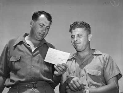 The Cleburne Country Club's 11th annual invitation golf tournament is now in progress. Aubrey Preston, left, and Doc Pickle are the club committeemen who have worked to make the tournament a success. They are standing outdoors. Preston is wearing a dark short-sleeved shirt tucked into trousers with a cloth belt. An undershirt is peeking out above the top button of his shirt. He is holding a printed card as Pickle looks on. Pickle is wearing a light colored short-sleeved shirt. He has a wrist watch on his left wrist.