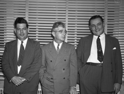 Four new officers of Bishop Dunne Council, Knights of Columbus, were elected this week. Left to right, three of the officers are R. E. McNally, chancellor, Mike Sullivan, grand knight, and Ed Leach, deputy grand knight. The council will be co-sponsor with Court Louise, Catholic Daughters of America, and with the Catholic Young People's Club of an appreciation dinner June 20 for Henry Love. They are standing in front of a window covered with Venetian blinds. The window is above a marble wall with a covered radiator slightly in view. They are all wearing double-breasted suits, light-colored shirts, and dark neckties. Leach has a handkerchief in his breast pocket. Sullivan is wearing eyeglasses and an unidentifiable small lapel pin. Leach has a tie chain.