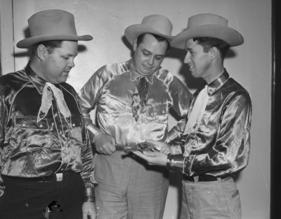 These Levelland, Texas, businessmen were in Fort Worth, Texas, advertising the Levelland, Texas, rodeo, to be held July 4-6. They are, left to tight, F. A. Benhow, J. D. Saunders and Alvin R. Allison, state representative. The rodeo will celebrate the city's 15th anniversary. The three men are standing against a bare wall, wearing matching satin button-down shirts and cowboy hats. Allison is holding a pistol and is turned towards Benhow and Saunders, who are looking down at the gun.