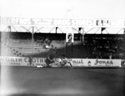 The Fort Worth Cats are facing the Beaumont Exporters "Shippers" at LaGrave Field. Action shot of an unidentified player sliding home.