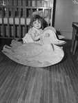 A curly-haired three-year-old girl is pictured here. She is shown seated in a toy duck in a room. In this picture she is trying to manipulate the rocking duck with her hands. Dozens of toys provided by the Lena Pope Home for the children in the new nursery. The nursery, 4809 Collinwood, the only one in the county accommodating small children, was furnished by Mrs. Pope and will be operated in connection with the home. Published in the Fort Worth Star-Telegram morning edition, March 18, 1945.
