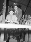 Southwest Exhibition and Fat Stock Show Champions Auction. Sergeant Warren Cowen, left, and Sergeant Ted Shrum act as buyers from McCloskey General Hospital. Sergeant Shrum lost his legs while fighting in the Pacific Arena. He is looking over the list of beefsteaks-on-the-hoof before making a bid. Sergeant's Shrum's bid was high enough to win the second prize Hereford in Class 1. He promptly donated the 905-pound animal to McCloskey General Hospital where both soldiers are stationed. Both men are wearing their military uniforms.