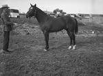 Southwestern Exhibition and Fat Stock Show Winning quarter Horses. "Scooter," owned by Punk Snyder of Melvin, Texas, is first prize winning stallion foal of 1943. There is a cowboy holding Scooter's lead rope. He is wearing a cowboy hat, leather jacket, cuffed jeans, and cowboy boots. There is a trailer and a railroad train in the distance.
