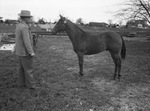 Southwestern Exhibition and Fat Stock Show Winning quarter Horses. "Sundown," owned by J. L. Hankins of Rocksprings, Texas. Sundown won first prize stud foal of 1944. Mr. Hankins is holding on to Sundown's lead rope. He is wearing a cowboy hat, sports coat, trousers, and cowboy boots. There are several automobiles and horse trailers in the background.