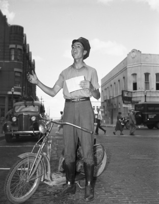 Robert Rohleder-- they call him the Bing Crosby of the Western Union messenger force--had reason to sing out Thursday, for the birthday greetings he was assigned to warble were addressed to the City of Fort Worth on her ninety-first anniversary. Robert, son of Mr. and Mrs. L. T. Rohleder, is standing beside his modern motor-bike at a downtown intersection. He learned to sing as a member of the school choir at St. Ignatius Academy. Rohlender is wearing a short sleeve button up shirt, trousers, belt, Western Union hat and shin guards with lace up dark shoes. Published in The Fort Worth Star-Telegram Evening Edition June 06, 1940.
