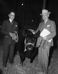 Southwestern Exposition and Fat Stock Show. Amon Carter and unidentified man with steer. Mr. Carter and the man are wearing suits and ties with inner collared shirts. Amon Carter has a hat on his head and he is holding the animal lead and a document in his left hand while he places his right hand above the head of the steer. The unidentified man is holding his hat in his hands and is wearing eyeglasses. They are standing outdoors in the field. Both men are looking towards the camera and smiling