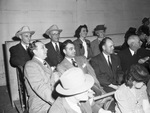 Southwestern Exposition and Fat Stock Show visitors. Back row, from left to right: Roland G. Mayer, Tom Girdler of Cleveland, Ohio, Miss Mary K. McKibbin, Girdler's secretary and Mrs. Mayer. Front row, from left to right: Raymond Buck of Fort Worth, Texas. W.H. Wright, Jean Perrot, co-pilot, and Barney Barbin, pilot. The group of visitors are seated and watching the awarding of rodeo and horse show championships.