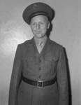 Private First Class Perry Gammage, former Golden Gloves official is now in the Marine Corps air service. He completed his training and is back in Fort Worth, Texas, on leave. He expects to ship out within the next few months. Private Gammage is standing against a wall, dressed in his military uniform.