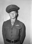 Corporal (Corp.) Albert Routh, 20, a dive bomber gunner with the First Air Wing of Marines is pictured here. He is shown standing against a bare wall, facing front and looking to the camera. He is dressed in marine uniform. He spent 18 months on active duty in the South Pacific. He wears the Presidential Unit Citation and is one of the first Texas boys to return from Luzon wearing the newly authorized ribbon for re-entry into the Philippines. He attended high school at Ballinger, Texas. After returning from Luzon, Corporal (Corp.) Routh is vising his aunt, Mrs. Uel Stephens. He will visit his parents, Mr. and Mrs. Oscar Routh of Ballinger, Texas, before reporting to Cherry Point, North Carolina, where he will attend gunnery school at the Marine base there. Published in the Fort Worth Star-Telegram morning edition, March 21, 1945.
