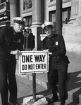 The experiment with one-way traffic in downtown Fort Worth, Texas is coming to an end. A traffic maintenance crew has been tasked with removing all one-way street signs from the north-south streets. Lending a hand to the maintenance crew, left to right, are Patrolman Kearney and Patrolman Pickens. They are shown removing one of the signs on Houston Street in front of the Continental Bank Building. They are dressed in their police officer uniforms.