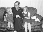 William Glenn Pace of the Navy and his nieces, Freddie Kay, 5, and Jimmie May, 10. They are daughters of Mr. and Mrs. J. H. Pace. The trio is sitting on a floral couch getting acquainted with each other. Mr. Pace is wearing a naval uniform and each niece is wearing a patterned dress. He has his arm around Freddie while Jimmie has her hands on his elbow. The nieces are looking up at him, smiling while Mr. Pace looks down at Freddie, smiling as well.