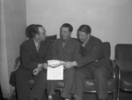 Baseball. Panther City League. Left to right, Marine Lieutenant Charles Dizney; ; Sergeant Dan Shepherd and Sergeant Martin Boyle of the United States Army Air Forces. Representatives of Fort Worth's two big military air training fields - Marine Air Station at Eagle Mountain and Fort Worth AAF - look forward to the coming baseball contests in the Panther City League. The three Sergeants are sitting next to each other on a couch looking over documents.
