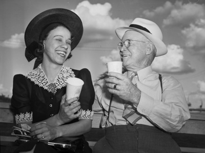 More than 300 employees and officers of the Gulf, Colorado and Santa Fe Railway, their families and guests gave themselves over to sports and barbecue at their annual picnic. Miss Margaret Innerhofer, left, stenographer in the office of the chief dispatcher, mingled refreshment and conversation in the company of Dan O'Brien, of Cleburne, Texas, oldest active conductor on the Santa Fe Lines, a railroad man for 51 years. They are sitting on a bench with drink cups in their hands. Miss Innerhofer is wearing a dark short-sleeved dress with crochet detailing on the collar and sleeves and buttons down the bodice. She also has on a hat with a dotted Swiss bow on the back of it. In her lap is a handbag and she is holding a pair of sunglasses. She has a ring on her left hand and a brooch pinned at the bottom of her collar neckline. Mr. O'Brien is wearing a light-colored long-sleeve shirt with a diagonal striped necktie. He has a pair of dark trousers with a button fly and held up by suspenders. He is wearing a ring on his left hand, and is wearing eyeglasses and a hat.