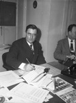 John Reeves, Local representative of the Brooklyn Baseball Club. He is sitting at a table covered in different photographs and documents while writing something down on a clipboard. One of the photos on the table looks like a group shot of a team of young girls. He is wearing a suit and a pair of glasses. Beside him is another man wearing a striped suit and looking away.