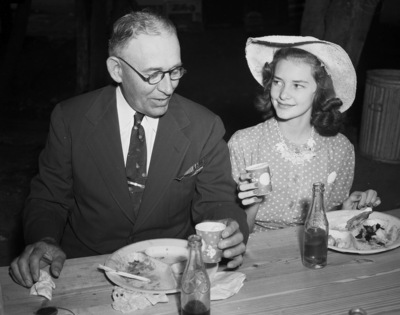 More than 300 employees and officers of the Gulf, Colorado and Santa Fe Railway, their families and guests gave themselves over to sports and barbecue at their annual picnic. H. A. Dornwell, left, Fort Worth, Texas, mechanical foreman, and his granddaughter, Joann McMahon. They are sitting at a wooden slat picnic table with paper plates, paper cups, napkins and plastic utensils. They are each holding a cup and there are two partially-filled soft-drink bottles at their dining places. Mr. Dornwell is wearing a single-breasted suit jacket over a light-colored dress shirt and a dark necktie with a tie tack and a handkerchief in his breast pocket. He is wearing eyeglasses. Miss McMahon is wearing a polka dot shirtwaist dress with a Peter Pan collar and a necklace. She is wearing a straw hat and has a handkerchief in her dress breast pocket.