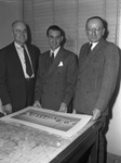Visitor from Venezuela. Left to right: Uel Stephens, City Water Superintendent; Uberto Mondolfi, from Caracas, Venezuela; and Sam Bothwell, City Manager. The man from "Down South American Way," Umberto Molndolfi arrived in Fort Worth to learn how water works are administered "Up North American Way." The three men are standing behind a table. There is a map and picture of a building on top of the table.