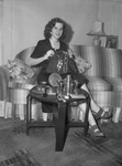Mrs. Joan McMillan received early 2nd anniversary gifts sent from her husband, Corporal Artie K. McMillan, crew chief on a C-47 , based with the 20th Air Force in India. Mrs. McMillan is sitting on a sofa holding a gift garment and displaying other gifts on the coffee table in front of her. Included among the anniversary gifts are a copper antique powder box, a silver cocktail set for six, a smoking set and stand, an ivory necklace, a matched jewelry set including earring, broach, bracelet, necklace and ring, and a 75-year calendar (1944-2018). Mrs. McMillan is the daughter of Mr. and Mrs. E. A. Culberhouse. Corporal McMillan received the Bronze Star medal in February 1944 for meritorious service on the Burma Road. He is a 1941 graduate of Technical High School and is the son of Mr. and Mrs. William K. McMillan. Published in the Fort Worth Star-Telegram morning edition, March 23, 1945.