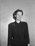 Miss Cyrene Bell is the head of the Dramatics department at Texas Wesleyan College (T. W. C.). She will direct the Footlite Club's final production of the season "The Terrible Meek." The play will be performed on Easter Sunday in Wesley Hall of the First Methodist Church. The theme of the play is built around a conversation between Mary Mother of Christ, the army captain who ordered the crucifixion, and the soldier who carried out the order. Miss Bell is shown standing against a wall, wearing a dark, button-up blouse with a flower pinned to the front.