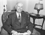 C. L. Sone, superintendent of Slaton Public schools. Mr. Sone is sitting on a patterned arm chair wearing a suit and smiling. On his lap he is holding a rolled up magazine with both hands. Behind him is a small table that has a lamp, a couple of magazines and an ash tray on it. There is also a an open door behind him.