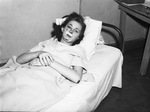 Mrs. Laura Nell Bowers, of Florida. Taxicab crash victim that was charged with robbery of Vaughn R. Blakley. Mrs. Bowers is shown laying in a hospital bed with a blanket over her. Her nose and chin are bloody and are covered by bandages. Her right eye, cheek and elbow also are bruised badly. Behind the bed is a table with a few items on it. .