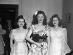 Texas Wesleyan College orchestra. Soloists from left to right: Mary Lyon Felty (pianist), Jane Puryear (violinist), and Effygens Chunn, (soprano). The trio of women are shown standing in front of a wall wearing different dresses. Miss Puryear's dress has a floral design on it, Miss Felty has short, sheer sleeves and little ruffles on her dress and Miss Chunn has long, sheer sleeves with small bows on her dress. Miss Puryear has her violin in one of her arms and is holding its bow in her hand. Behind them is a wall and a few other women in dresses.