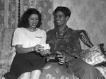 Corporal Julian Guajardo shown with his sister, Bernice. He was a prisoner of the Japanese for two and half years. Cpl. Guajardo was captured at the fall of Corregidor and liberated from Bilibid prison Feb. 4. Corporal Guajardo sitting on a couch next to his sister as she holds Japanese money.