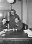 The first dividend check to a mortgagor in the northwestern district of Texas was presented recently by E. T. Stearns, district Federal Housing Administration director, to John R. Clark, left, a presentation resulting from the mutual mortgage insurance fund established under the national housing act. Standing is E. G. Parker, vice president of the First National Bank, which made the original loan, insured in 1935. Published in the Fort Worth Star-Telegram morning edition, April 8, 1945.