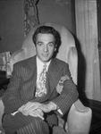 Portrait of Gene Krupa, who arrived in Fort Worth by Army transport plane from Oklahoma City to play a four-hour jam session on the Casino's bandstand. He and his band members arrived by Army transport plane from Oklahoma City, where they played for service men at Will Rogers Memorial Field. Krupa comes from Chicago and first won national fame as drummer with Benny Goodman's band. He likes playing for the "kids" and will keep drumming as long as they ask for it. He is wearing a suit and sitting on a sofa. Published in the Fort Worth Star-Telegram morning edition, April 7, 1945.