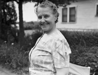 Mrs. Alex Vaught, whose garden won first prize in the Class AA category of the Arlington Junior Chamber of Commerce's yard beautification contest. Mrs. Vaught is standing outside in her garden. She is wearing a floral print dress. Her body is in a profile position facing left but her face is turned towards the camera. She is smiling.