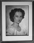 This painting of Katherine Howard, from the chest up, is in a matted frame. She is slightly turned, with her head facing forward. Her blouse has an elastic scoop neckline. She has her hair parted in the middle, with the front part smoothed back. The rest of the hair is styled in tight curls. She is smiling slightly.